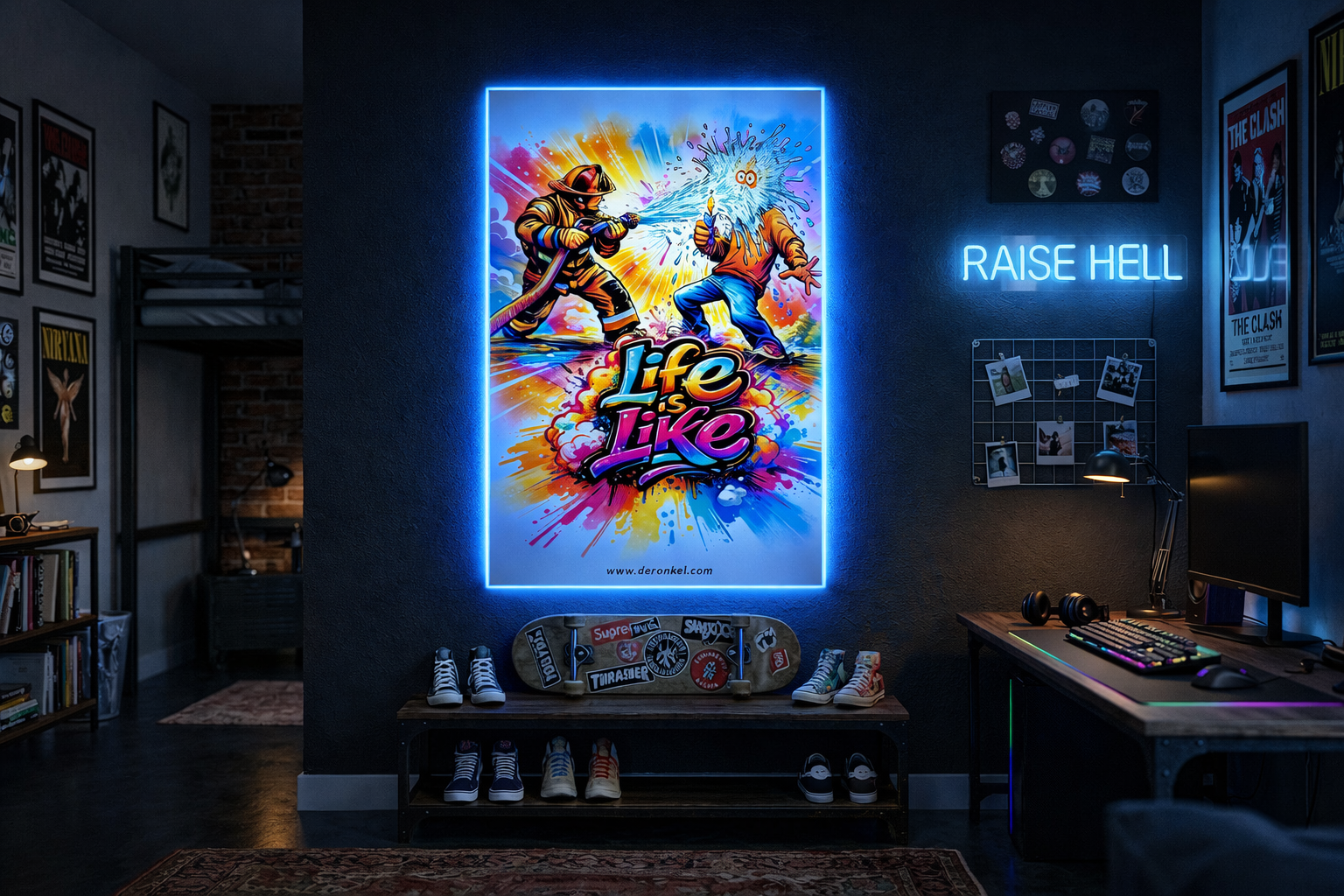 Die Acrylglasgemälde der Serie „Life is Like“ verbinden starke Bildideen mit leuchtender Inszenierung. Gedruckt auf hochwertigem Acrylglas entfalten die farbintensiven Motive ihre volle Wirkung, während die integrierte Neonbeleuchtung auf der Rückseite einen atmosphärischen Glow erzeugt. So entsteht ein modernes Wandobjekt zwischen Illustration, Pop-Art und Lichtinstallation. Die humorvollen Szenen erzählen kleine Geschichten über das Leben – überraschend, ironisch und visuell kraftvoll. Ob im Wohnzimmer, Studio oder Büro: Diese leuchtenden Kunstwerke setzen einen markanten, zeitgemäßen Akzent an jeder Wand.
