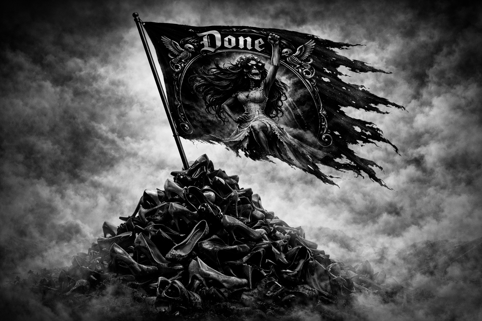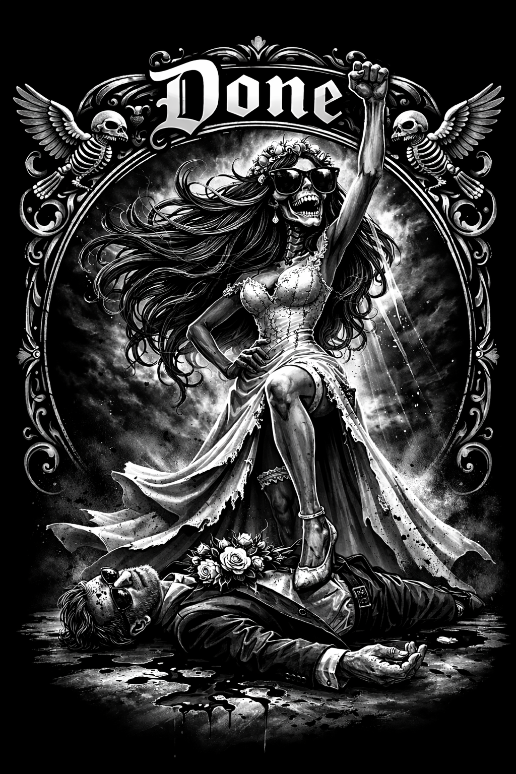 Entstanden ist „Done“ aus der Idee, dem klassischen Tohuwabohu um die Ehe mit einem Augenzwinkern zu begegnen. Statt standard Shirts setzt das Design auf eine starke, ikonische Bildsprache zwischen Rock, Tattoo-Art und Clubkultur. Das Ergebnis: ein Motiv, das Haltung zeigt und sofort Aufmerksamkeit erzeugt.
